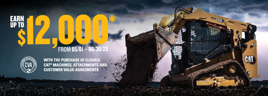 You could earn up to $12,000 in Cat® Credits with the purchase of eligible Cat machines, attachments and Customer Value Agreements (CVA).