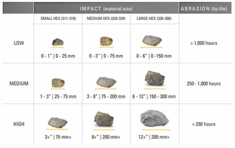 There are three main factors to consider first when choosing tips for a job: strength, penetration, and wear life. Depending on the material you’re digging into, these factors will help you decide which tip option is best: